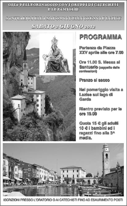 Ho paura di usare l’espressione “fine anno catechistico”, perché ho paura che per molti voglia significare fine della S. Messa domenicale. L’anno catechistico è vero si conclude, ma le attività promosse dalla Parrocchia e dall’oratorio continuano. Ci attendono infatti il Grest e i campi in montagna, i tornei ed altre serate da trascorrere in allegria. Per rinsaldare quell’amicizia che nasce tra i ragazzi, i catechisti e le famiglie, anche quest’anno il 2 giugno, approfittando della festività civile, ci recheremo al Santuario della Madonna della Corona, abbarbicato sulla roccia in posizione dominante sulla Val d’Adige. Nel pomeriggio faremo poi sosta a Lazise sul Lago di Garda per una passeggiata tra i negozietti tipici, il porticciolo, il lungo lago e gustare un buon gelato. Sarebbe davvero bello passare insieme una giornata e mi auguro che come gli scorsi anni, possiamo almeno riempire un pullman. Nessuno è escluso, anche i nonni possono accompagnare i nipoti. Ad essere però particolarmente invitati sono i catechisti, gli aiuti catechisti, i ragazzi e le loro famiglie. Un bel modo per chiudere l’anno catechistico e aprire l’oratorio estivo.