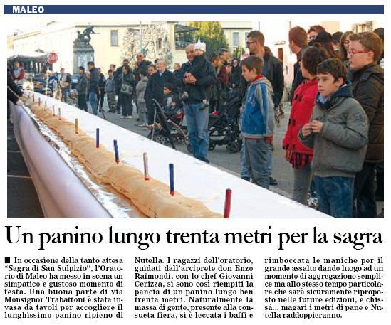davanti all'oratorio verrà proposto dalla Parrocchia il 'Panino dell'amicizia'. Un lunghissimo panino, offerto quest'anno dal panificio Casali, farcito alla nutella per festeggiare i 350 anni della festa di S, Sulpizio